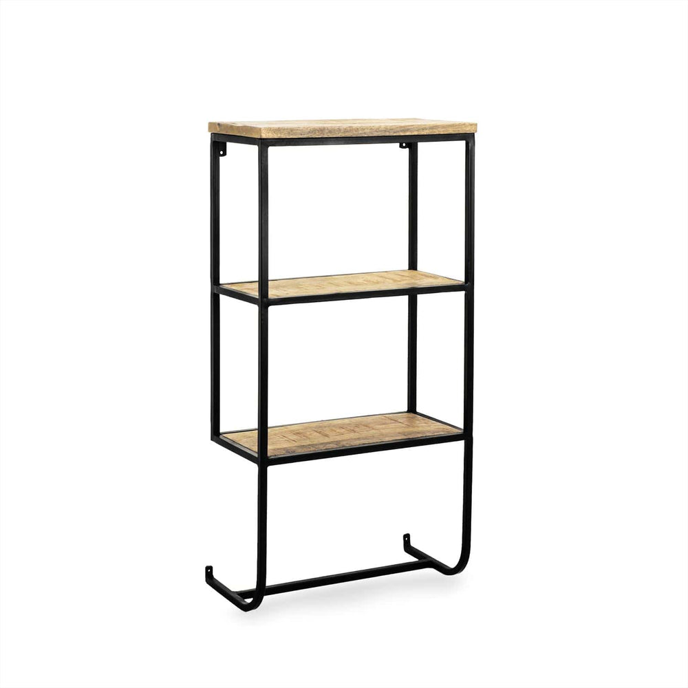 De drie planken zijn vervaardigd uit massief mangohout, wat een warme en natuurlijke charme geeft die prachtig contrasteert met het industriële staal. Dit wandrek is perfect voor het etaleren van boeken, hangplanten of je favoriete decoratieve items. Aan de onderzijde loopt het frame door in een decoratieve boog, wat het strakke lijnenspel een uniek visueel detail geeft.