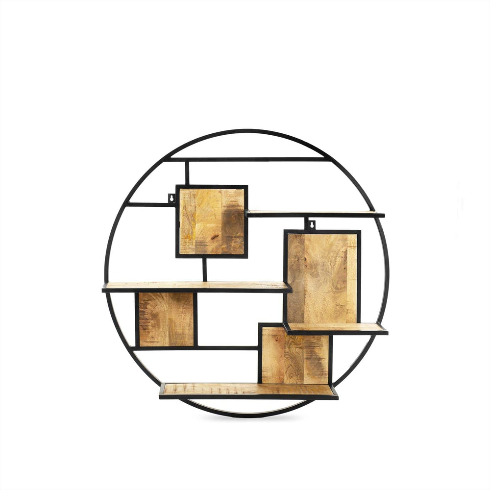 Geef uw interieur een unieke upgrade met dit opvallende ronde wandrek. Met een royale diameter van 80 cm is dit meubel ontworpen om een statement te maken aan elke muur. Het wandrek combineert een stevig, zwart gepoedercoat metalen frame met speels geplaatste planken van massief mangohout, wat zorgt voor een perfecte balans tussen industriële kracht en natuurlijke warmte.